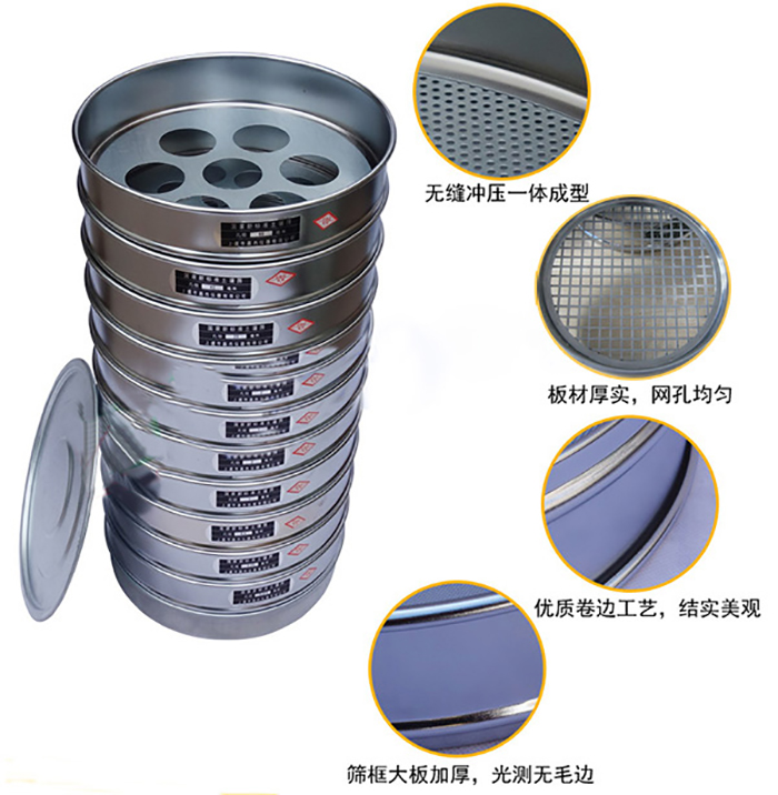 φ200mm (10只/套+底蓋)0.075、0.25、0.5、1.0、2.0、5、10、20、40、60mm標準篩框材質(zhì):由不銹鋼板、黃銅板、冷軋鐵皮(鍍鉻或鋅),塑料等材料構(gòu)成。采用一次沖壓成型,篩框平整、光潔度高、套篩組裝互換。